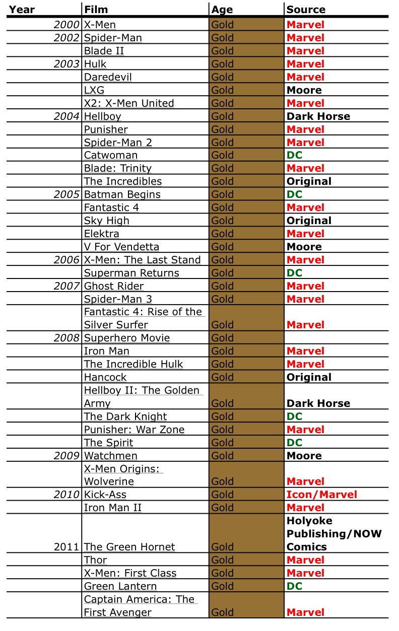 This is the first part of what will be a growing chart here on AP2HYCape. This first portion lists most of the Superhero Films that have been released since 1951 by date, as well as noting which age they belong to and what company provided the source material for the films.