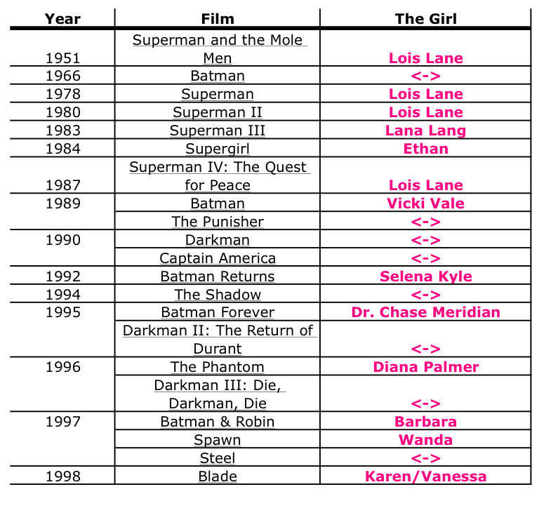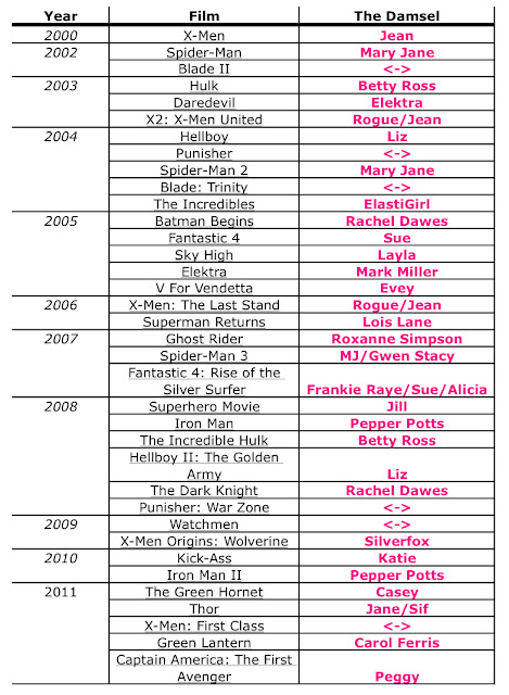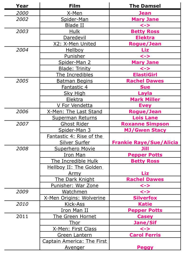 Ok folks, here’s the Damsel section of the chart. Again, the “” symbol means that either that it was unclear which character fit the role best or, in cases where the film hasn’t been released yet, that there is no way of knowing yet. All entries for unreleased films are best guesses.