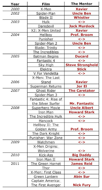 Here’s the Mentors section of the enormous chart. Like before, the “” symbol means that either that it was unclear which character fit the role best or, in cases where the film hasn’t been released yet, that there is no way of knowing. All entries for unreleased films are best guesses.