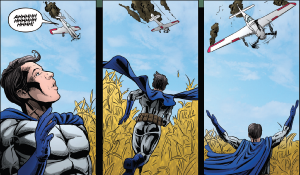 We meet Jack and Alicia on a park bench as the sun sets behind them. Jack is a down-on-his-luck superhero lamenting how he feels unable to help anyone lately. By the time he arrives on the scene of a crisis, the problem has already been resolved or there never happened to be one in the first place. Through Jack’s reflections, we are taken in just a few panels to a burning building, a cornfield straight out of North by Northwest, and a roaring storm at sea. Peyton Freeman‘s coloring shines best in these moments, darting between hot reds and deep blues from panel to panel.